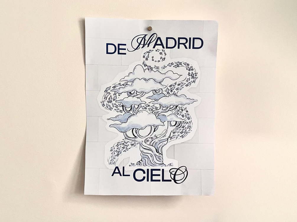 Diseño de póster titulado “Madrid al Cielo”, inspirado en la leyenda detrás de esta expresión icónica y su profundo significado para el pueblo de Madrid. Lo explico en este vídeo.